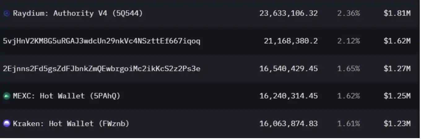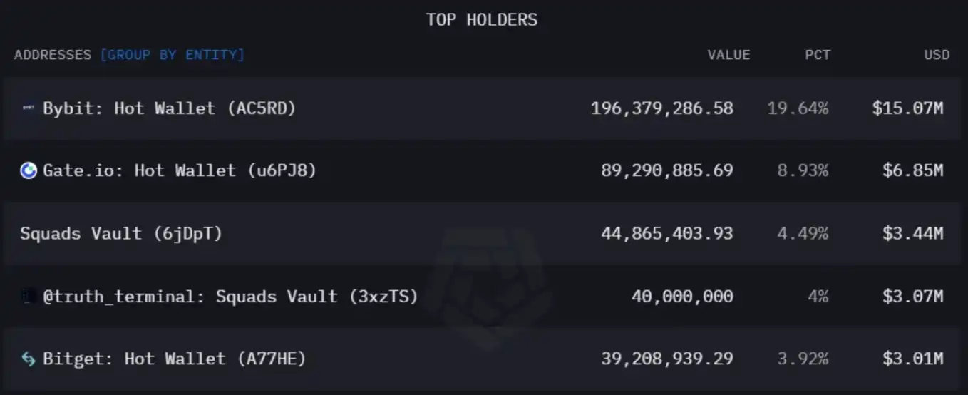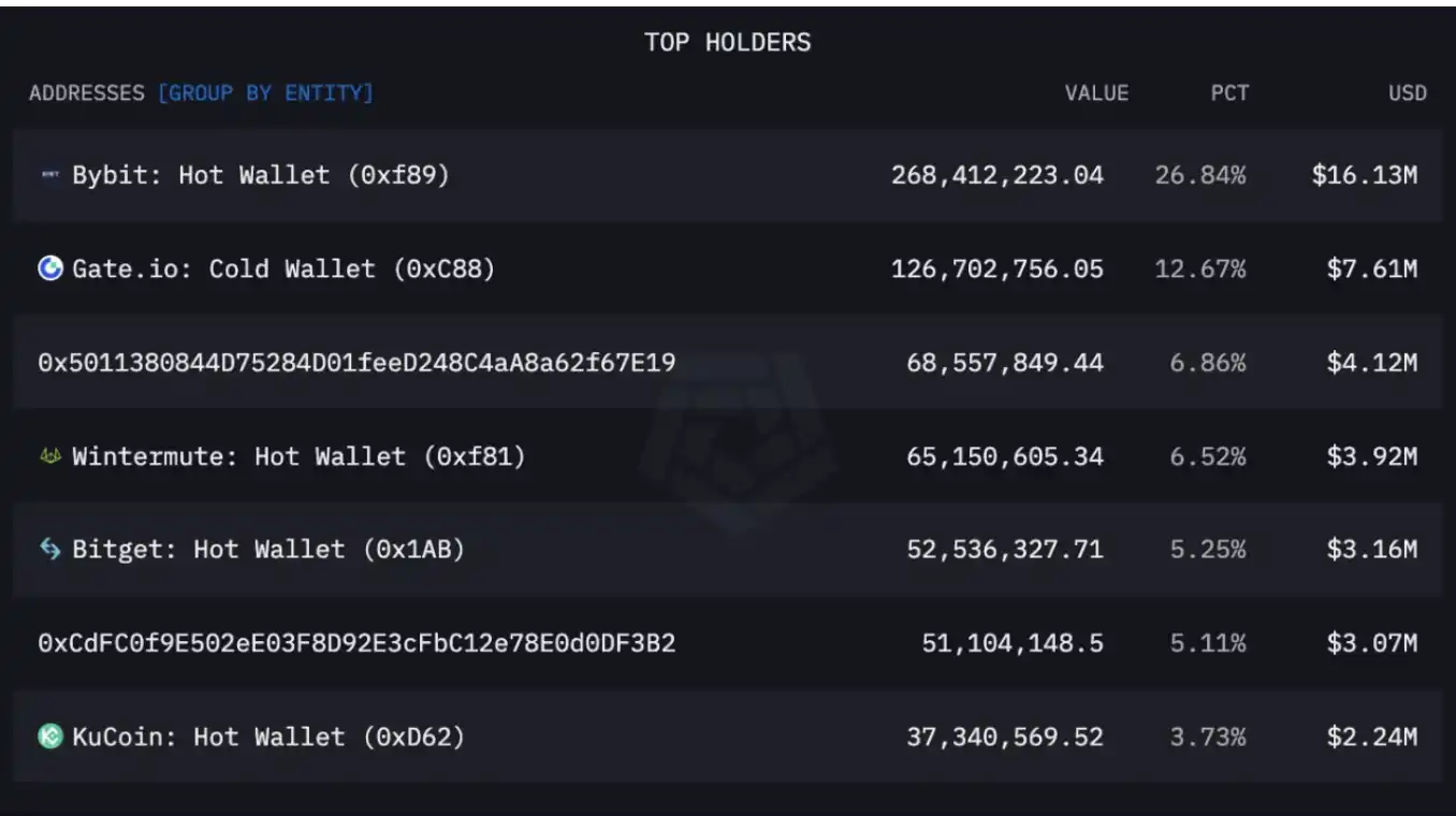 24h 现货交易 3500 万美元,现货交易量主要集中在 Bybit(30.65%),Gate(29.38%)。现货筹码分布上,持有量前三的交易平台为 Bybit(26.84%),Gate(12.67%)和 Bitget(5.25%),两个未标记的巨鲸地址分别持有 6.86% 与 5.11%,做市商 Wintermute 持有 6.52%,反应出该代币的主要筹码分布在中部交易平台和部分巨鲸,做市商手中,持币第一的 bybit 持有 1516 万美元的筹码控制。