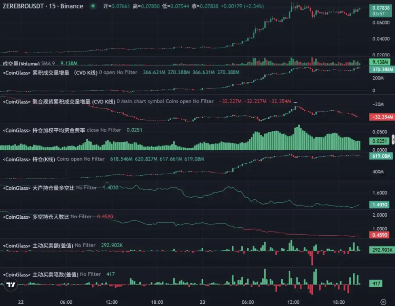 合约 CVD 持续上升,处于强势位置。现货 CVD 有所下降,上涨动力不足。资金费率为正,高于平时水平,表明大量资金在建多头仓位。持仓量经历了快速地增长,目前仍保持在较高的位置,尚未出现明显减仓行为。大户持仓量多空比为 1.4,大户看多。多空持仓人数比为 0.45,大资金在看多。从主动买卖额(差值)来看,4 月 23 日凌晨出现密集的买入,卖出相对较少。