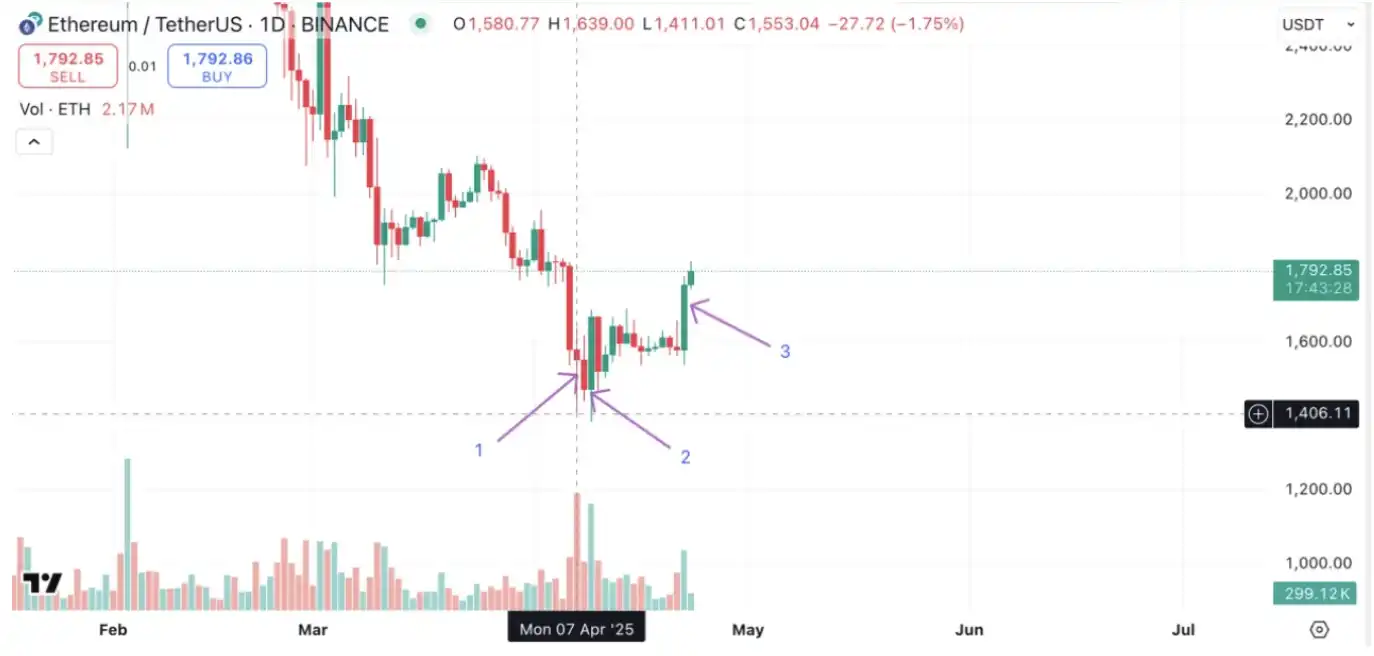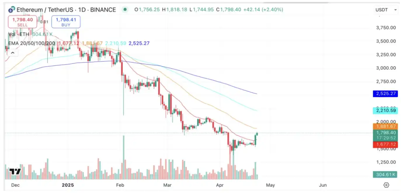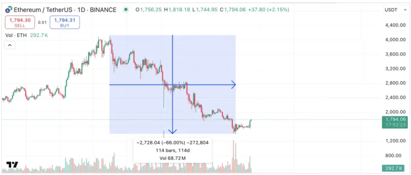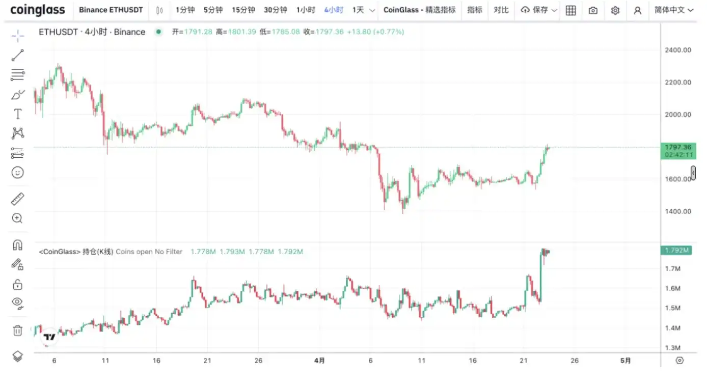 在过去近四个月,ETH 长期处于下行通道,从最高点 4100 至最低点 1385 价格跌幅 66%。近期从盘面上可以观察到多头展开有力防守,截止 4 月 23 日从最低点价格反弹约 30% 来到 1800 美元附近。
