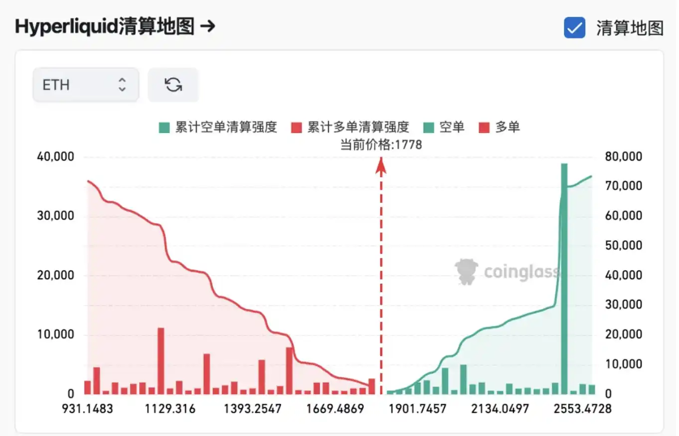 Hyperliquid 上空单清算价格集中在 2478 美元,其次为 1896 美元和 1931 美元,而多单清算价格则相对比较分散,分别在 1765 美元、1471 美元、1426 美元及更低价格 1099 美元。