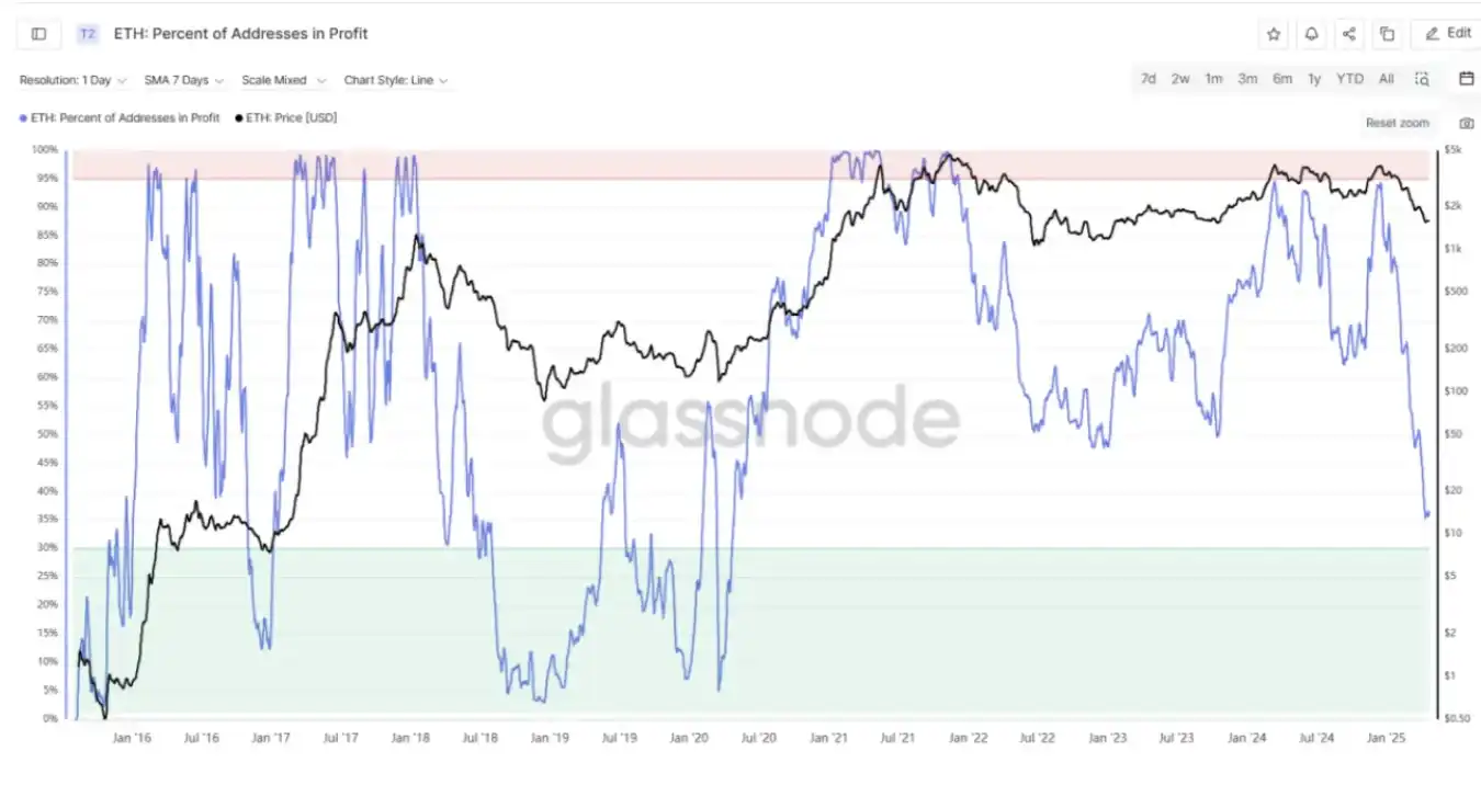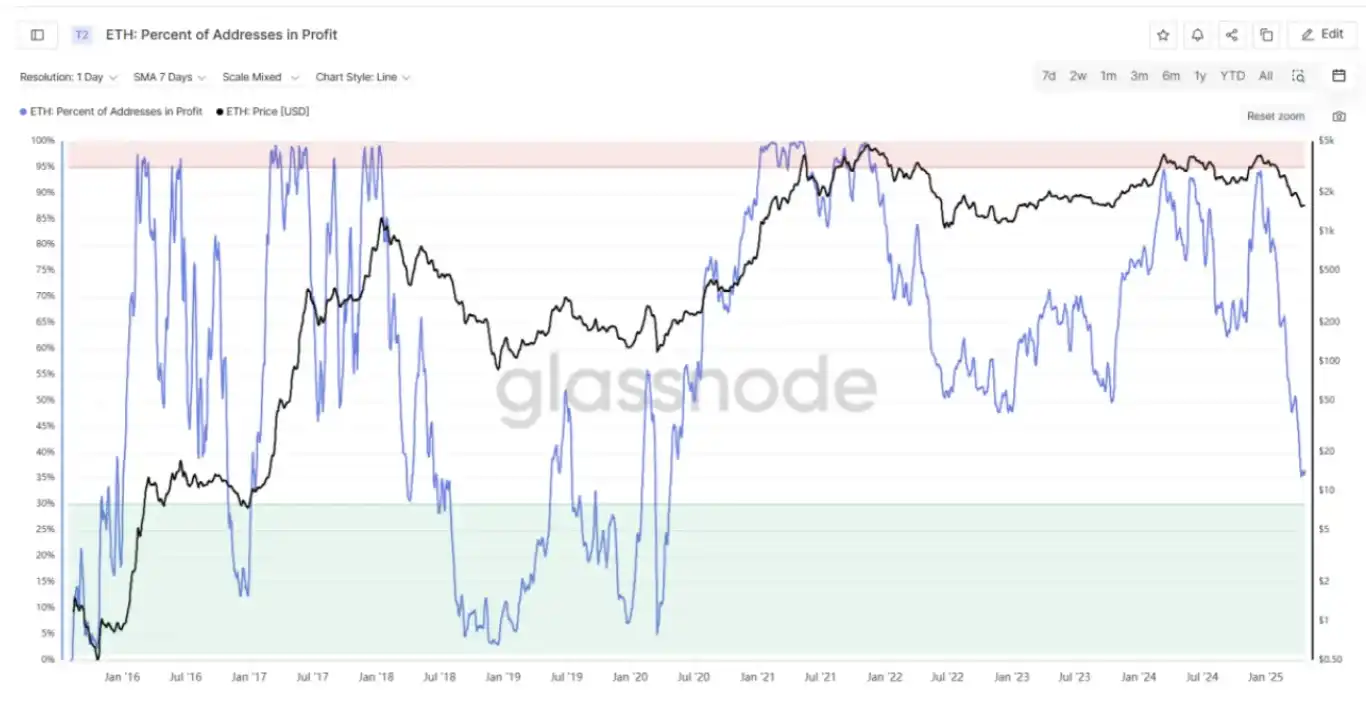 盈利地址急速下降,从去年 12 月底接近 95% 的盈利,下降至只有 35% 左右的地址还在盈利。这一水平甚至低于 2022 年熊市期间。
