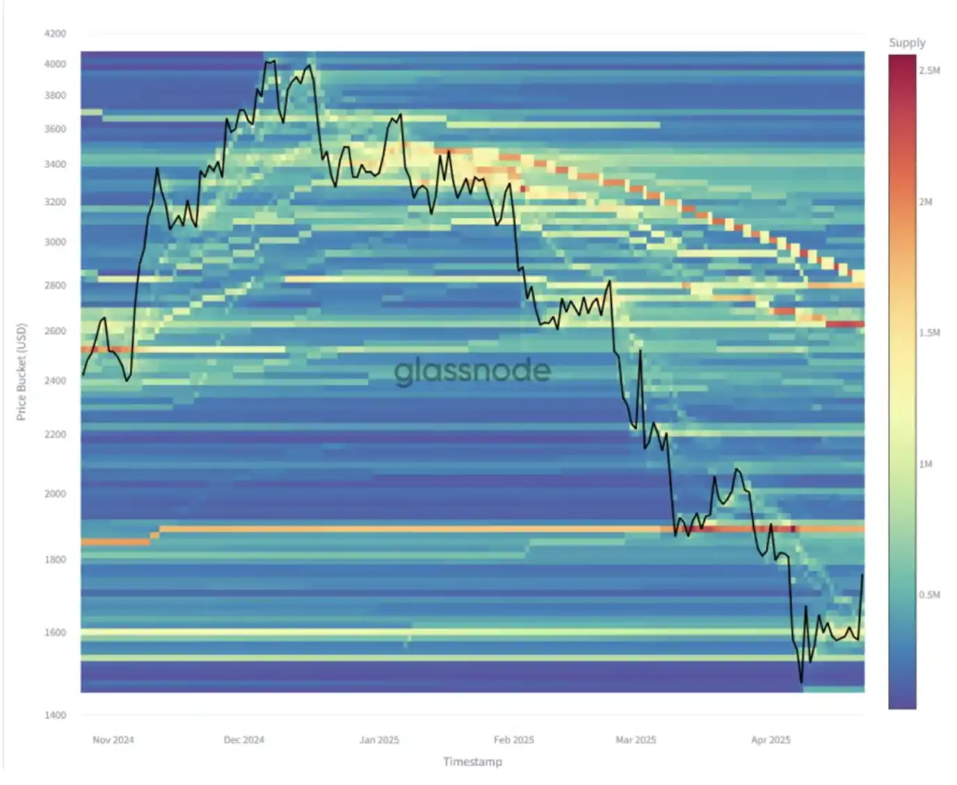 3200–3400 美元区域,随着时间的推移,持有者没有能够坚定持有,而是割肉离场(颜色从橙色、黄色变为绿色)。2600–2800 美元区域,累积的时间短,但目前看仍然在持仓状态中,没有大量离场。1850 美元区域是长期持有者持仓,自 2024 年 11 月持仓至今没有大的变化。1650 美元是本次下跌后寻找新的底部而形成的累积区域。