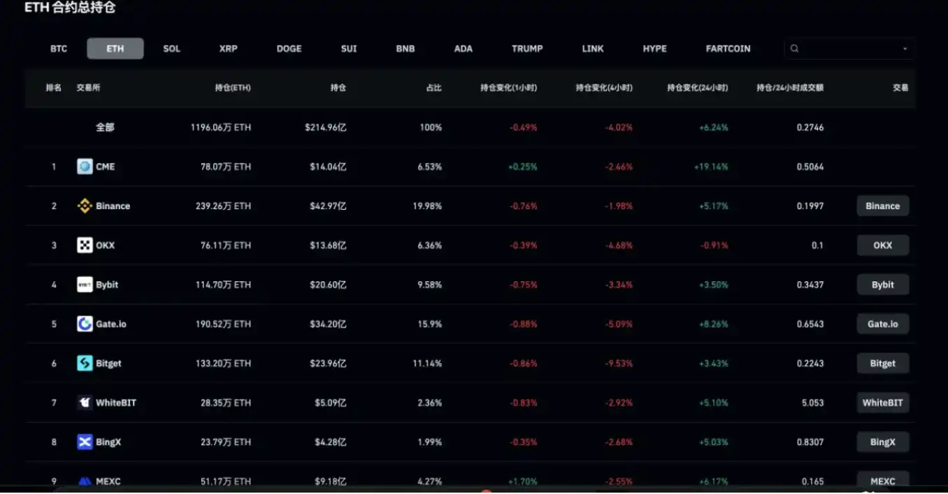 目前 ETH 合约持仓总量为 218.21 亿美元,市值为 2169 亿美元,OI/MC 在 10% 左右。这个指标在大币种中 BTC 为 3.5%,SOL 7.3%,BNB 为 0.9%,可见 ETH 在合约上具有更具流动性和参考意义。