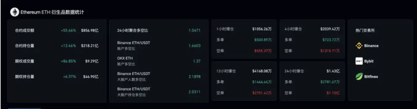 2、合约数据分析:ETH 作为市值第二大加密货币,具有庞大的合约市场规模,交易平台的合约规模是其钱包余额的数倍甚至数十倍以上,目前合约市场出现了一定程度与现货资金同步带动上涨的状态。