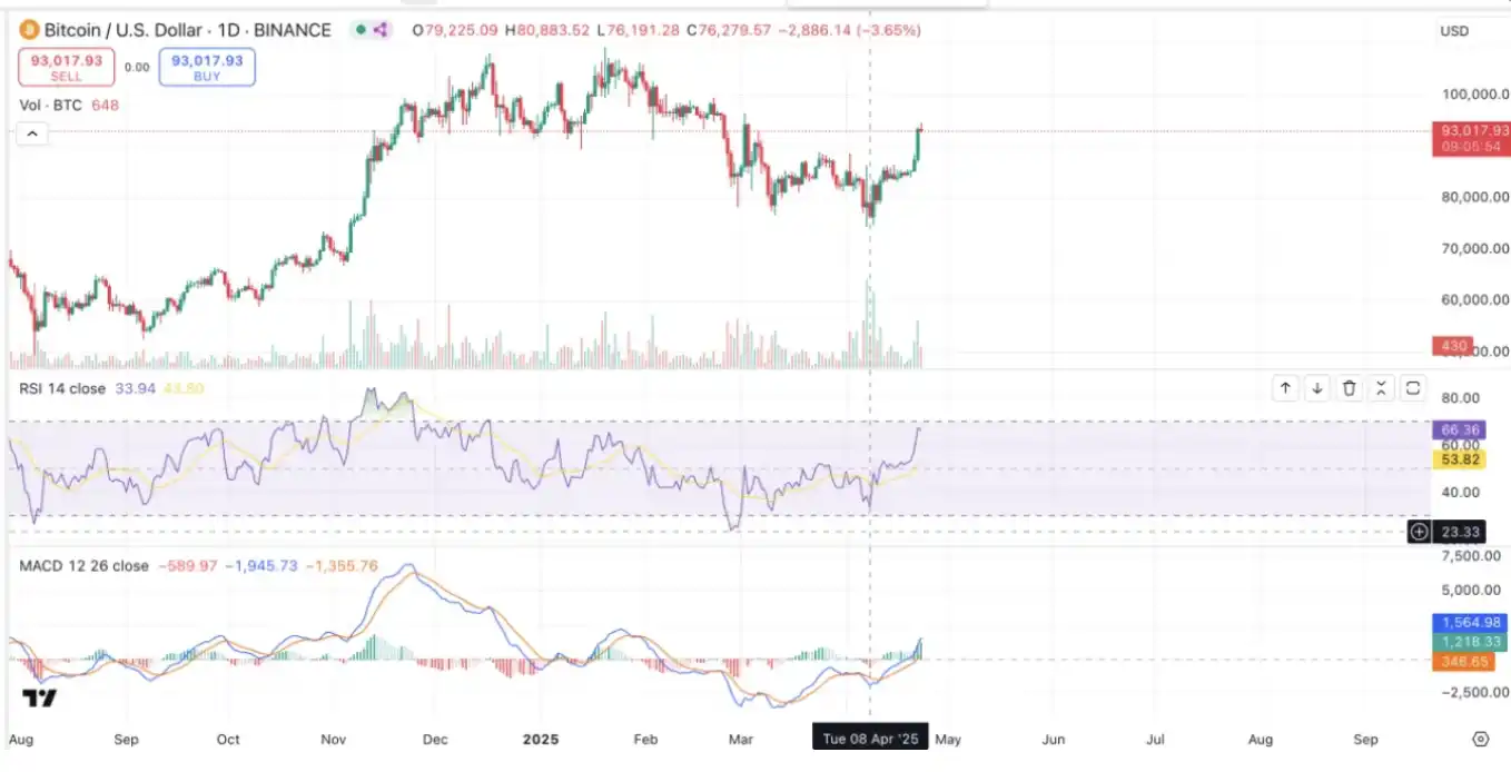 3 月中旬以来,BTC 整体表现强于美股,体现出了一部分类似黄金的避险属性。4 月 8 日附近 BTC 的 RSI 和 MACD 都出现了底背离的情形,叠加情绪指标来到极度恐慌的位置,形成近期的底部。截至目前 MACD 快线和慢线都来到了零轴上方,市场趋势从空头转向多头。