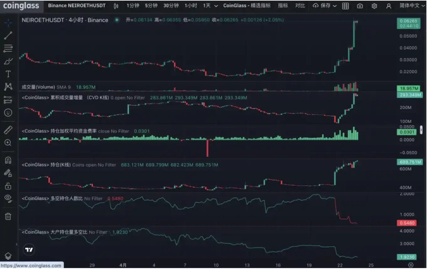 拆解细分指标来看,根据 Coinglass 数据显示,NEIROETH 目前全网聚合多空比为 1.05,