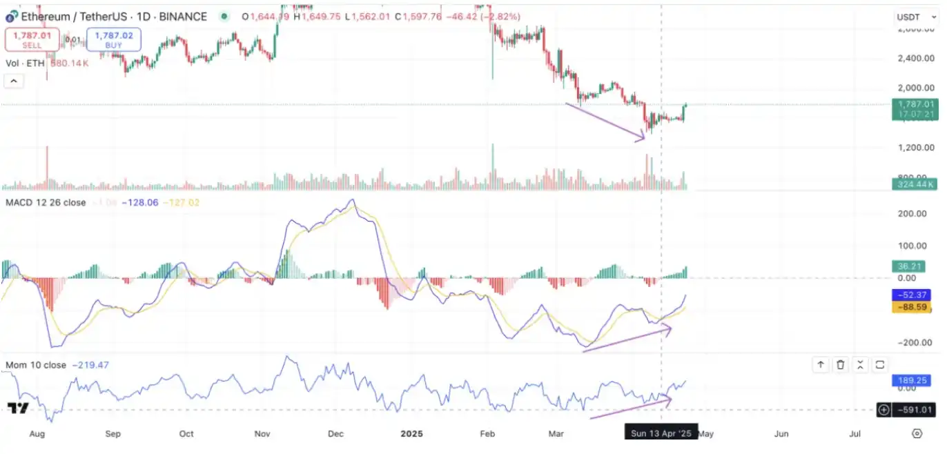 可以观察到非常明显的日线级别的 macd 和动量的背离,即价格创新低,但指标不创新低,意味着空头力量在这里的减弱,同意预示着下行趋势的停止可能。同时 4 月 13 日 macd 快线上穿慢线形成金叉,提供了一个潜在的买点。