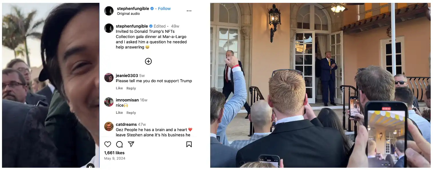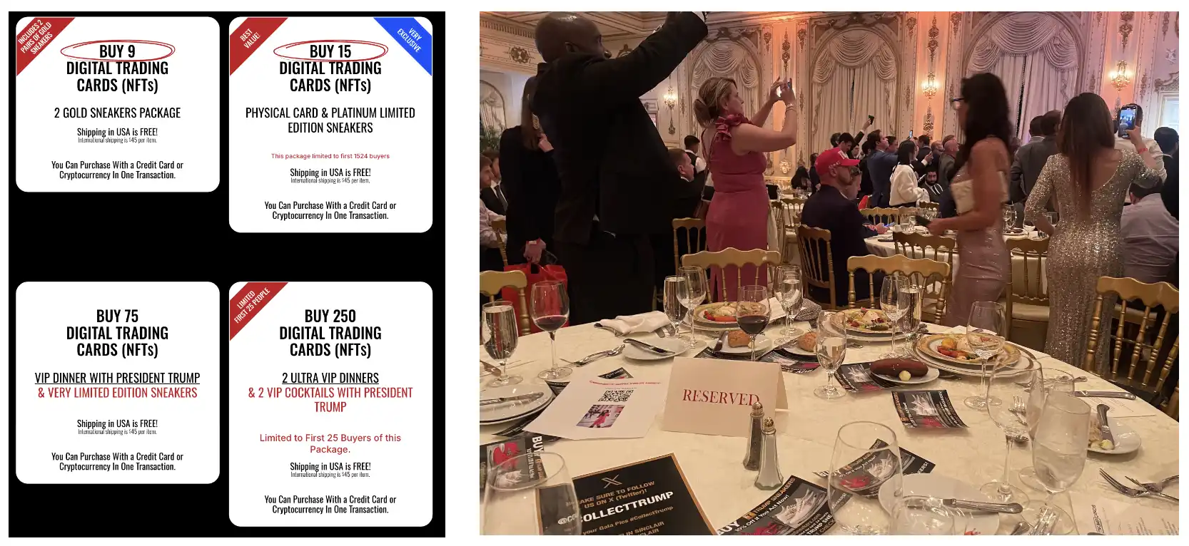这种将稀缺性与名人效应结合的策略,推出时迅速点燃市场热情。在 2024 年,首批约 5 万个 NFT,定价每张 99 美元,竟在不到一天内售罄。而且规则规定,只有首批购买者才有资格参加盛大的晚宴活动,真可谓精准拿捏粉丝的 FOMO 心理。据报道,许多人购买了 1 万美元的特朗普交易卡 NFT,只为参加这场在佛罗里达前总统宫殿举办的超现实、闷热的户外招待会。