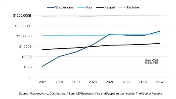 「稳定币生态系统处理的交易量少于 Visa 或 PayPal,但平均每笔交易金额却大得多。2023 年,Visa 处理了 2760 亿笔支付,每笔平均 54 美元;PayPal 为 250 亿笔,平均 61 美元。而 Fedwire 则只处理了 1.93 亿笔,但每笔高达 560 万美元。相比之下,稳定币在 2023 年处理了 26 亿笔交易,平均每笔金额为 4200 美元,正好处在零售和机构交易之间的中间地带。」