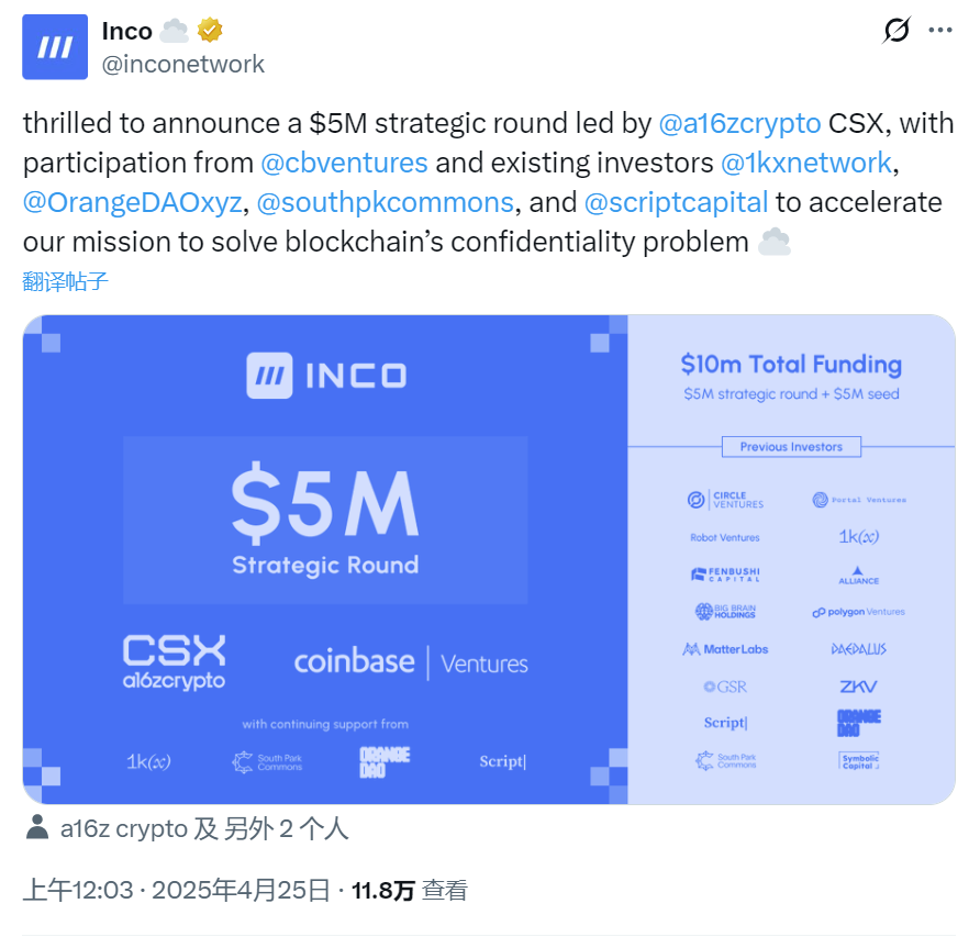 随后,2025 年 4 月,Inco 再次完成了 500 万美元的战略融资,a16z crypto CSX 和 Coinbase Ventures 等知名机构参投,总融资额达到 950 万美元。投资方既涵盖 a16z、Coinbase 这类头部 VC,也包括 Orange DAO、SPC 等社区和技术导向力量。
