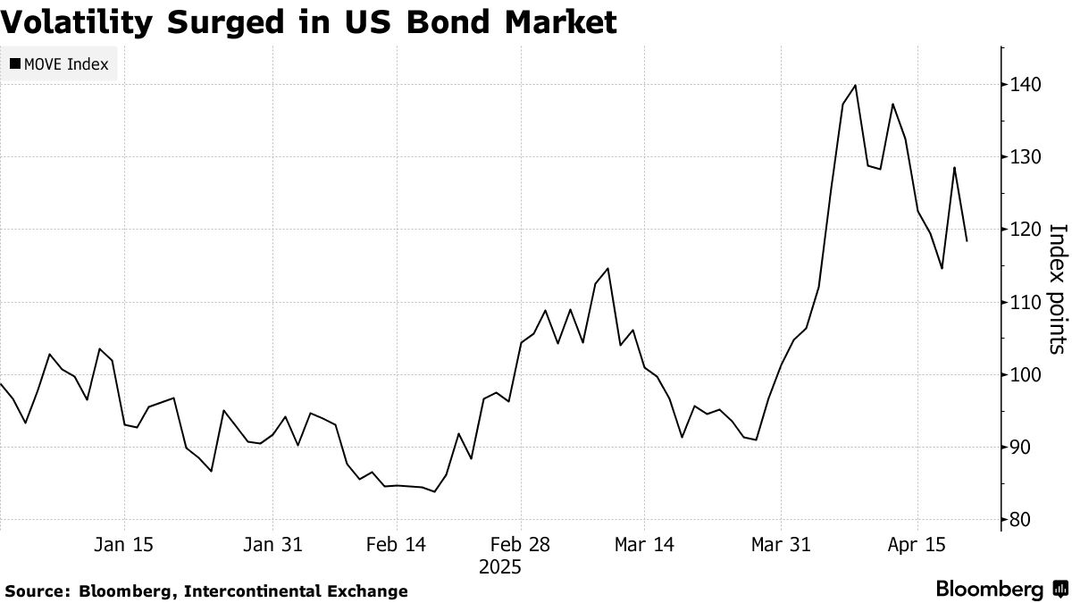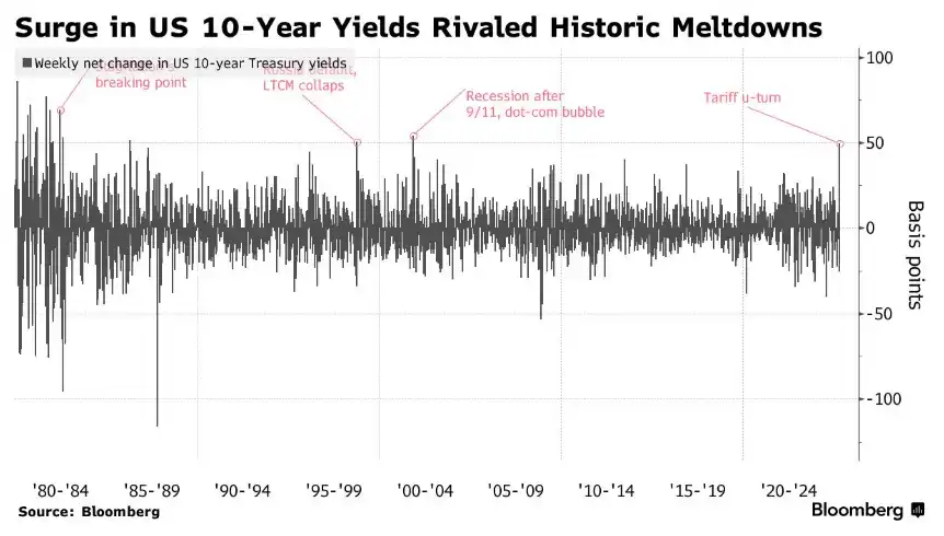 然而在 4 月初,特朗普总统实施「对等」关税引发的混乱中,出现了一件不同寻常的事。随着股票和加密货币等风险资产的暴跌,美国国债价格非但没有上涨,反而随之下跌。美国国债收益率创下二十多年来最大单周涨幅。