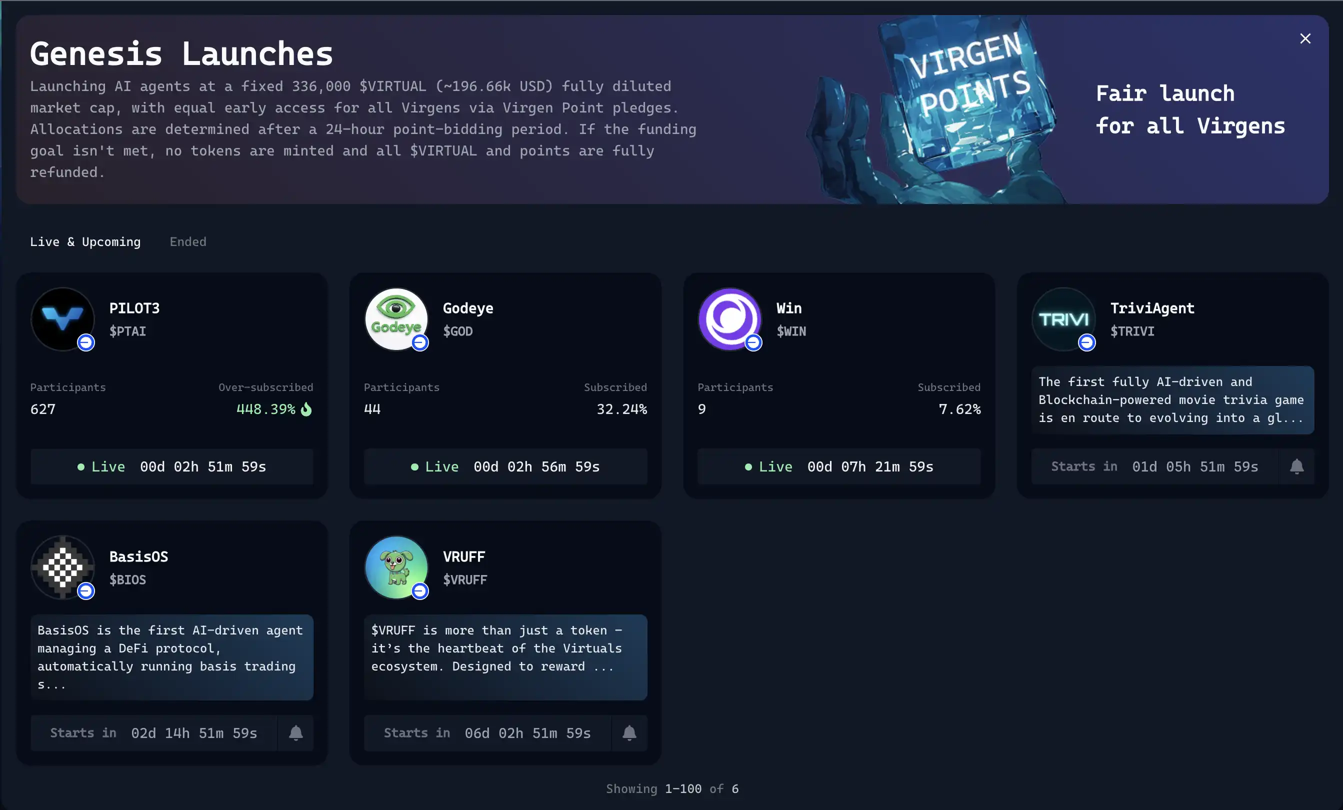 在 4 月份 Virtuals 刚刚推出了 Virgen 积分和 Genesis 发射模式的新模式,用户可以通过投资 Sentient 和 Prototype 的 Agent、持有 Virtuals、质押 VADER 等方式获取积分,而积分是参与 Genesis 发射台项目的基础。Genesis 发射台则是 IDO 模式的项目启动方式,根据用户拥有的 Points 来获取投资额度。而这种发射模式目前并非所有人都可以参与,而是需要经过 Virtuals 官方的审核。