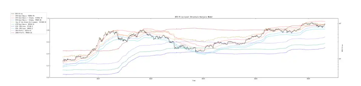 从⽬前结构来看,短期成本 93000 左右⽬前是重要的⽀撑位。同时,随着市场结构演变,存量顶的价位在 100000 左右。若购买⼒持续性递增,或巨鲸群体的持有意愿未下降,可能市场有触及存量顶的预期。但⽬前市场可能偏向于调整和蓄⼒交叠的复杂结构。从下图中可看出。