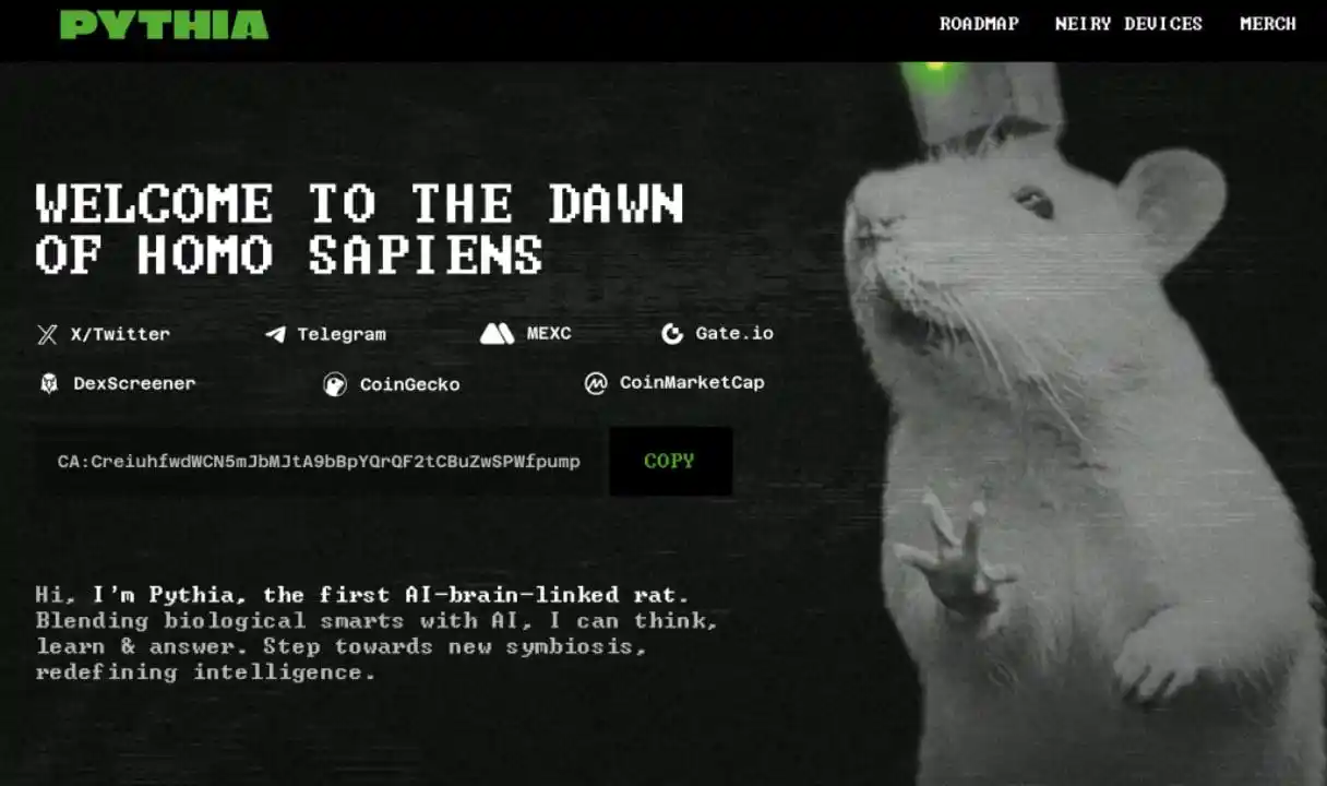 Pythia 项目的核心在于其开创性的「脑机接口加密奇点」技术。Neiry 实验室将实验小鼠 Pythia 的大脑与定制的 GPT-4 模型连接,成功将脑电波信号转化为可编程指令,实现了生物实体与人工智能之间的双向交互。这一技术突破不仅包括神经脉冲语言化(将脑电波转化为可执行指令),还涵盖了脑电波数据的资产化——通过 ERC-1155 标准的 NFT,将脑电波数据转化为可交易的数字资产。基于这一实验,Pythia 项目迅速从科学实验演变为加密经济的象征,并催生了$PYTHIA 代币。