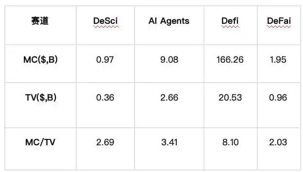当前 DeSci 赛道整体市值约为 10 亿美元,日均交易量维持在 800 万-1200 万美元 区间,市值/交易量比率(MC/TV)达到 8-15 倍,显著高于传统科技股(标普 500 平均 MC/TV 约 0.3 倍)甚至加密货币主流赛道(DeFi 平均 MC/TV 约 3 倍)。这种异常比值揭示了市场的深层逻辑: