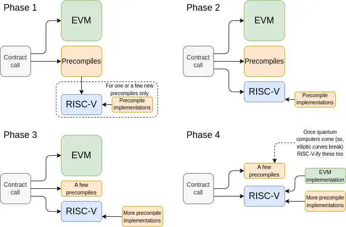 4. 在 RISC-V 中实现 EVM 解释器:作为智能合约上链(因 ZK 证明器需要已进行)。在初始发布数年后,现有 EVM 合约通过该解释器运行。