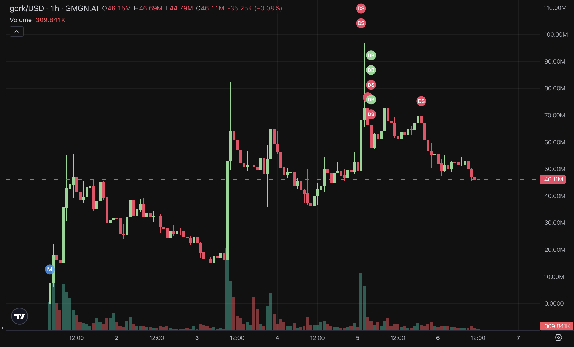 5 月 5 日,马斯克将 X 头像更换为「gork」主题类 Meme 图,并将 X 昵称更换为「gorklon rust」,此前昵称为「Elon Musk」。受马斯克更换 X 头像影响,gork 短时涨超 107% 后回落,市值曾冲高至 1 亿美元,现回落至 4600 万美元。