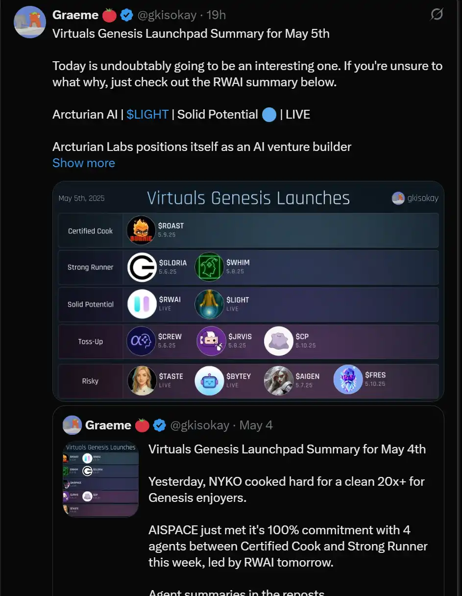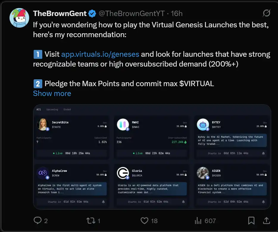 Virtuals 的主要批评之一是代币发售常常被抢购,普通用户很难参与。这个问题已经部分解决,通过调整 Virgen 积分机制,使其成为 Genesis 发售的资格标准。