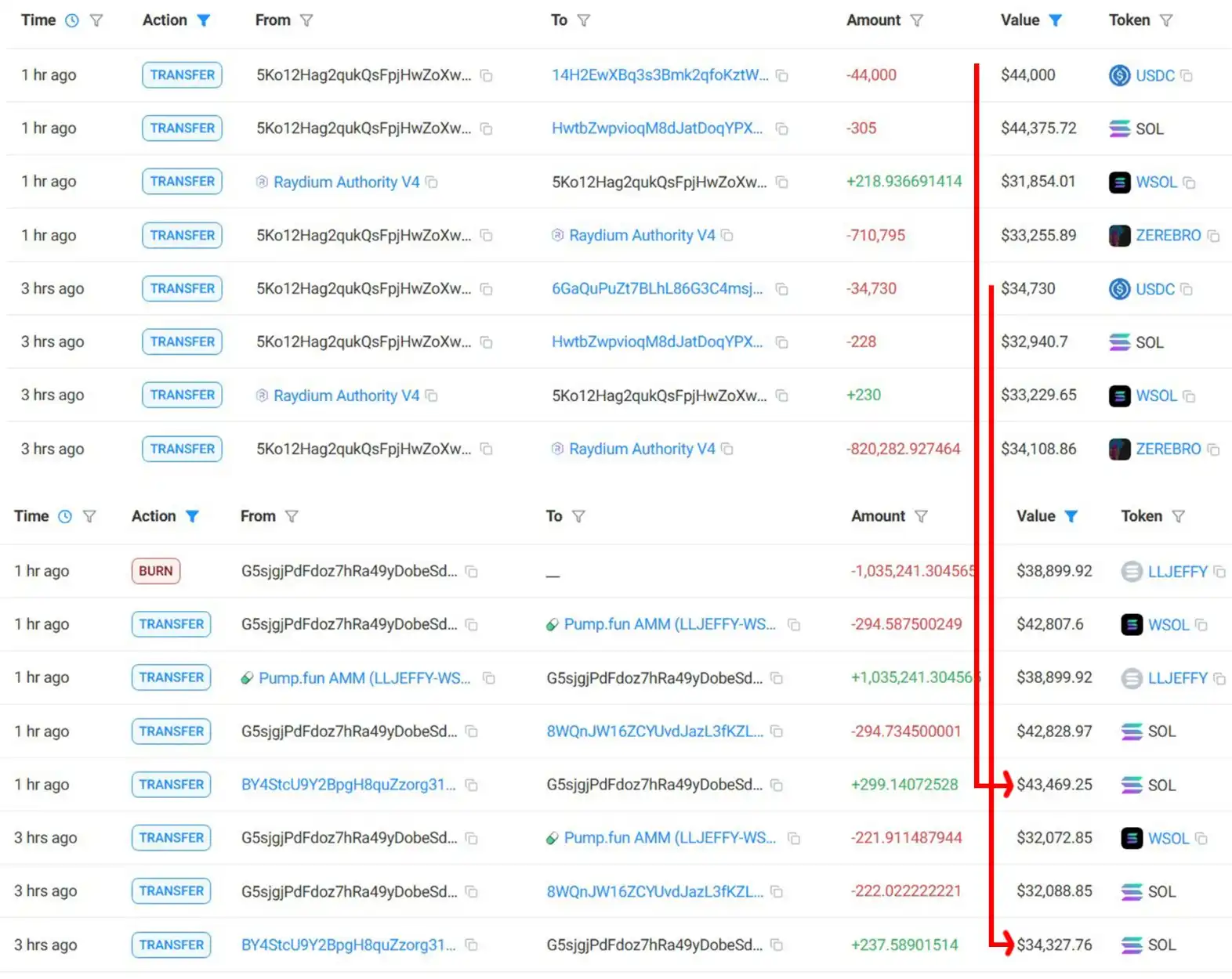 今日下午,Jeffy 的讣告截图发酵后,$LLJEFFY 市值短时暴涨至 540 万美元,目前已跌至 160 万美元附近。而在这个过程中,有一地址一直在执行买币、烧币的动作。