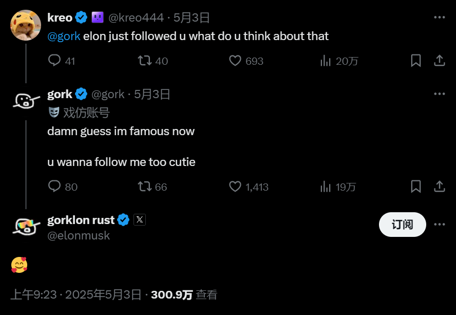 5 月 1 日,GORK 官推发布了一项回归公告,不久之后 Moonshot 上线 Solana 链上 Meme 币 GORK,5 小时市值突破 5000 万美元。5 月 3 日,马斯克在 X 平台关注 @gork 账号,并在相关推文下回复笑脸表情,名人效应引发了社区对 gork 项目的关注。