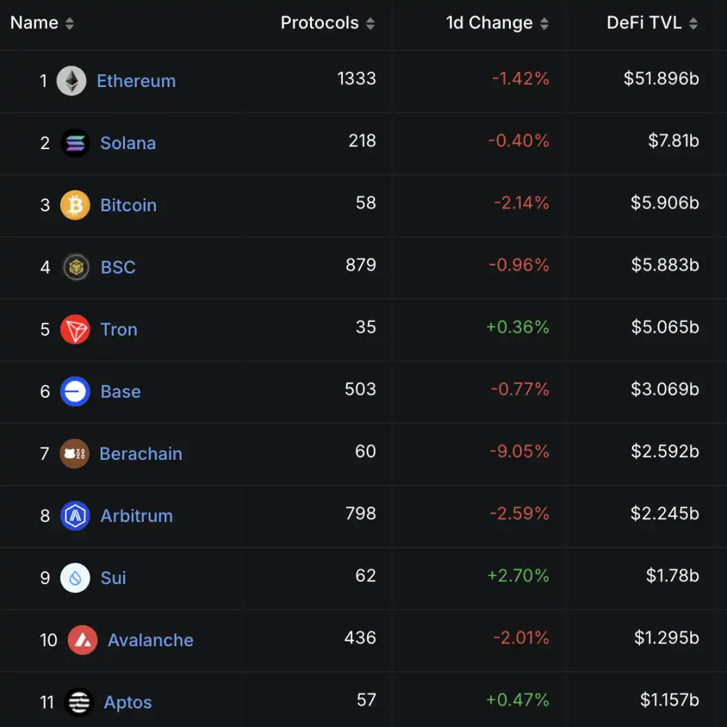 公链 DeFi TVL 排行,数据:DeFiLlama
