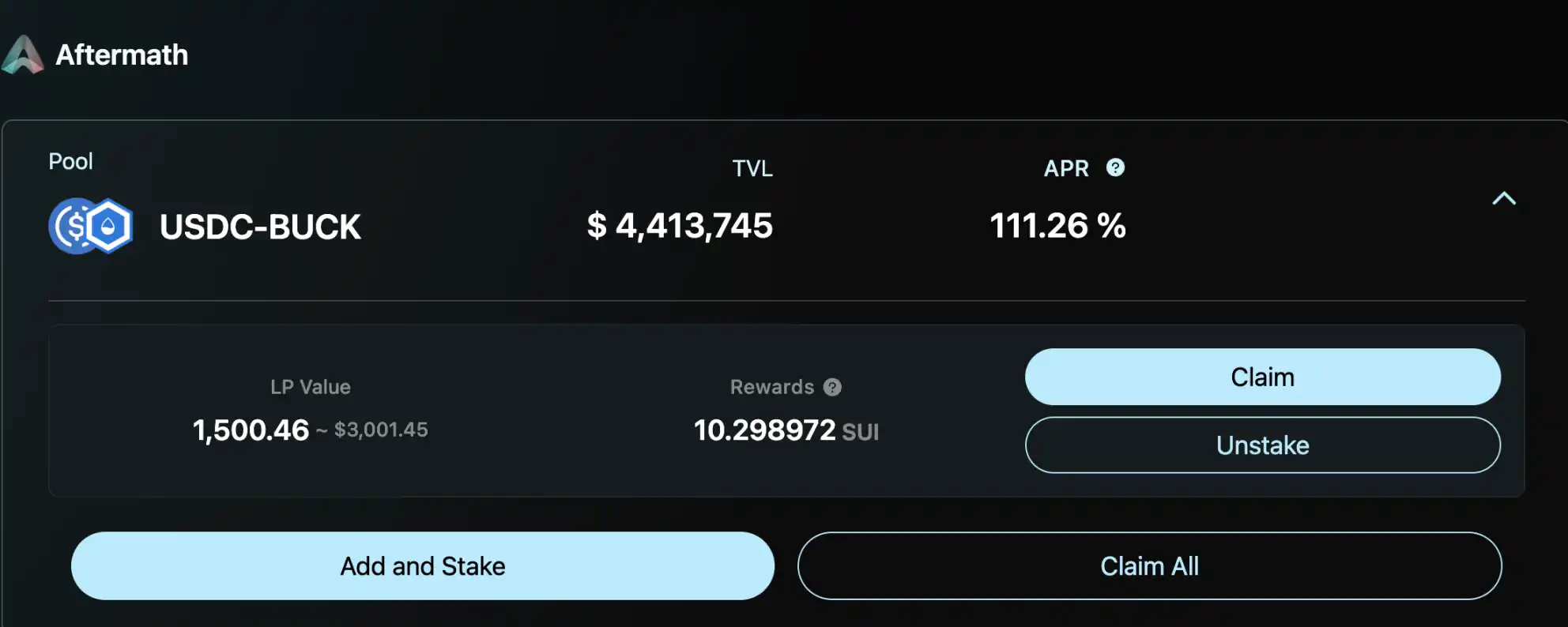 早期在 Aftermath 质押稳定币 LP 的利率高达 110%