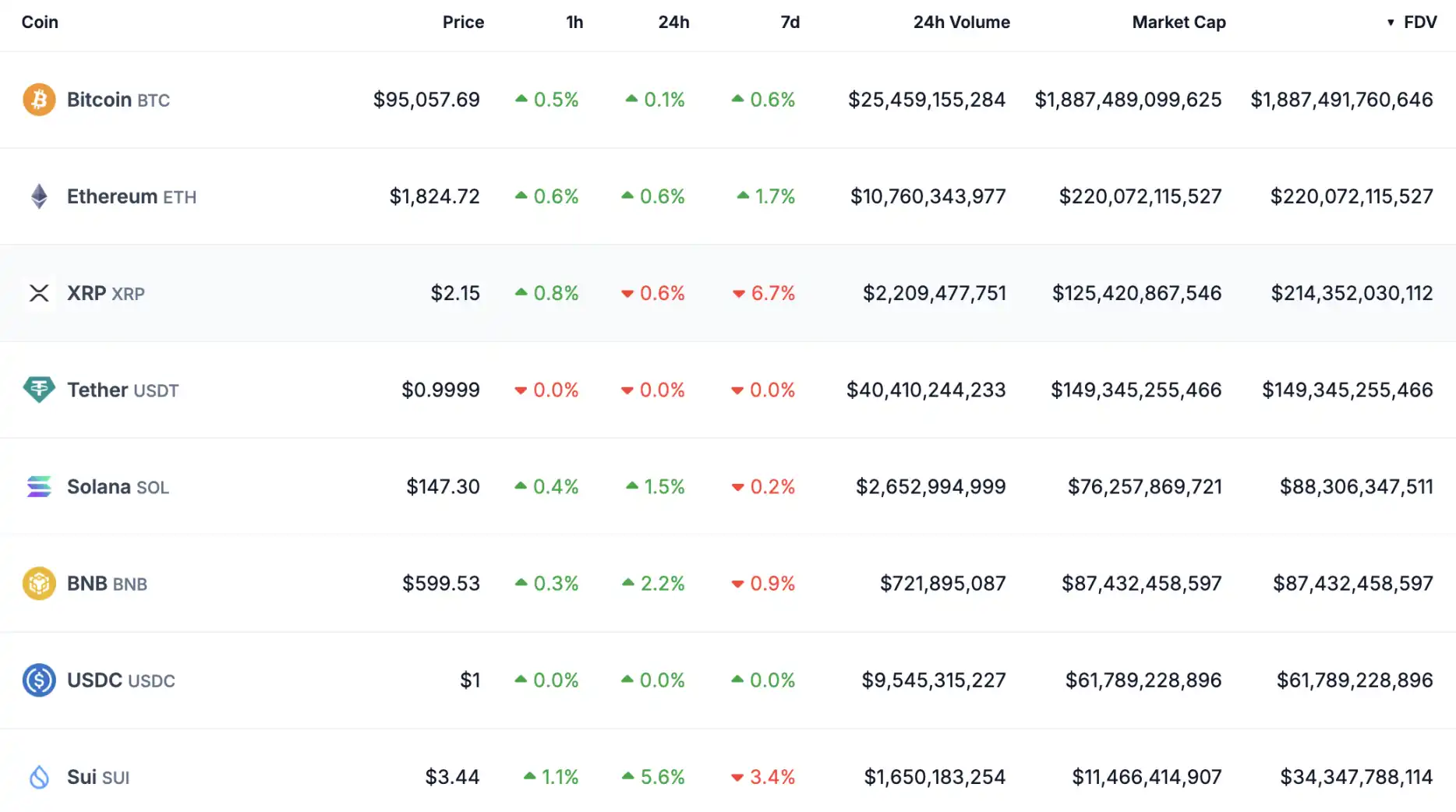 短短两年过去,一切都改变了。在比特币于 16000 美元筑底最终突破 10 万美元的这轮周期中,Sui 是毫无疑问的新公链主角。放眼整个公链版图,风头也仅略逊于在本轮「涅槃重生」的 Solana。事实上,Sui 治理代币 SUI 的 FDV(完全流通市值)在非稳定币中已仅次于 BTC、ETH、XRP、SOL、BNB,是全行业中的第六大加密资产。