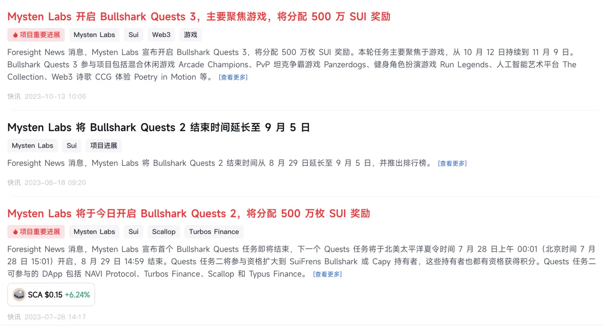 自 23 年 7 月起,Mysten Labs(Sui 开发商)在不到半年的时间中接连推出 3 期 Bullshark Quests,用户完成任务即可获得 SUI 代币空投,每期 500 万枚,累积「撒币」1500 万枚。