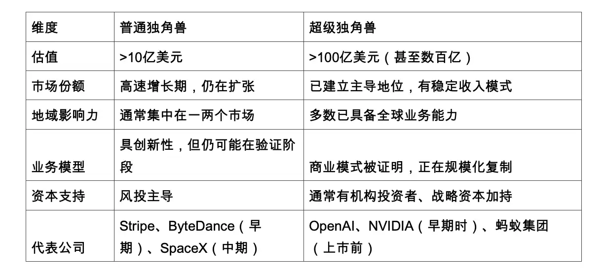 当独角兽进一步突破天花板,具备全球影响力、更大规模的用户体量与商业布局时,就迈入了超级独角兽的行列。超级独角兽企业不仅估值达到数百亿美元级别,更具备改变行业格局、引领下一代技术或基础设施演进的能力。
