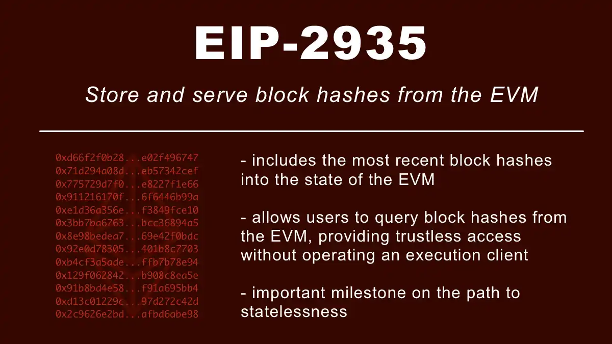 该提案添加了一个系统合约,用于检索历史区块哈希(最多可追溯到 8,192 个区块),解决了当前 BLOCKHASH 操作码的 256 区块限制问题。