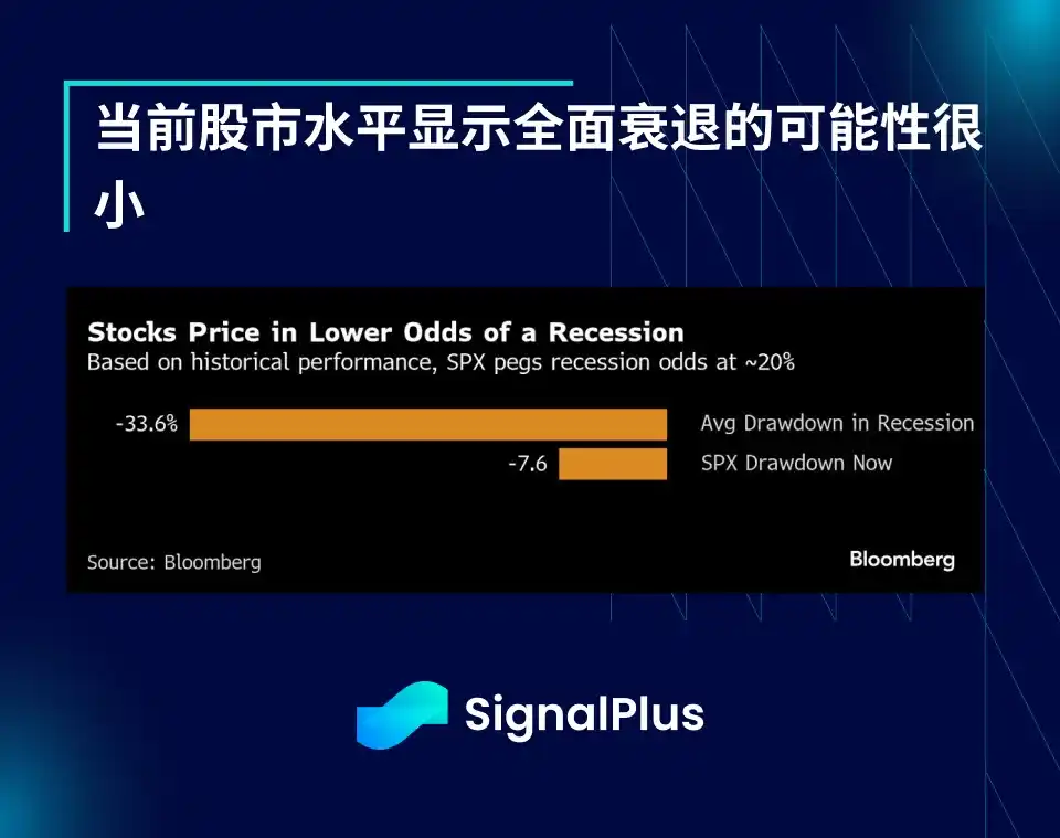 此外,根据以往经济放缓的平均回撤水平,目前股市反弹情况所隐含的经济衰退可能性仅约 8%,远低于经济学家的估计或固定收益市场所隐含的水平。