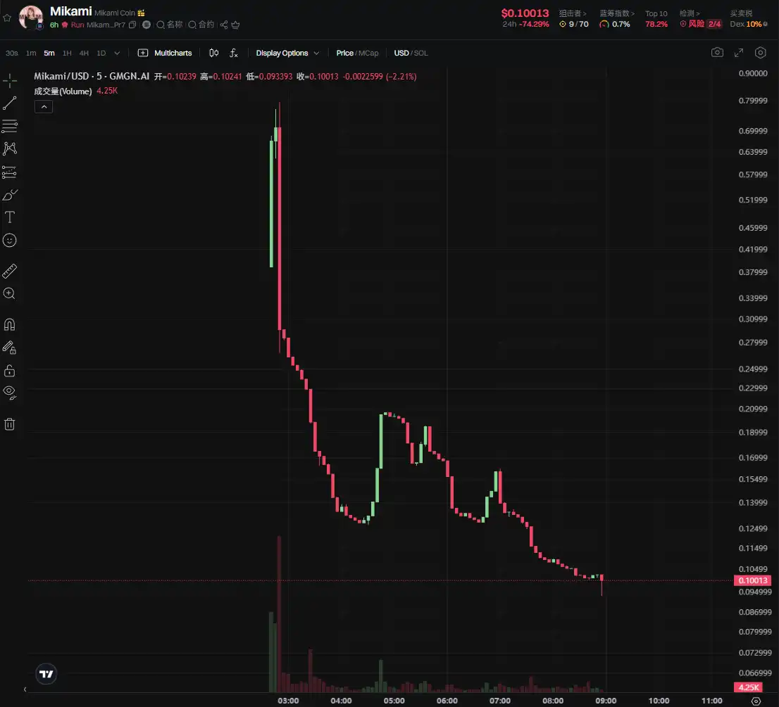 2025 年 5 月 8 日凌晨,$Mikami 代币在 Solana 链上悄然上线。官方账号在 X 平台宣布代币上链,空投按预售时间顺序分发,初始市值 1690 万美元,流通市值 845 万。然而,午夜的钟声尚未敲响,喜悦已化为噩梦。到凌晨 4 点,X 社区成员惊呼代币「崩了」,价格从预售的 0.245 美元跌至 0.1 美元,暴跌 60%。到早晨,市值进一步缩水至 780 万美元,较最高点下跌 85%,几乎「十倍归零」。「这简直是偷袭!」一位社区成员怒斥,午夜开盘的时机仿佛精心设计,专「掐」散户的睡眠时间,让「领导先走」。