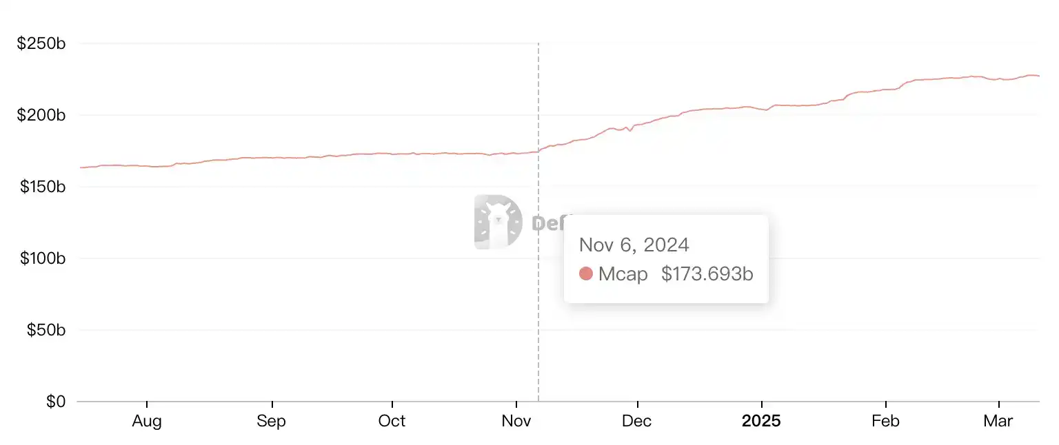 稳定币总市值自特朗普当选后激增 500 亿美元;图源:DeFiLlama