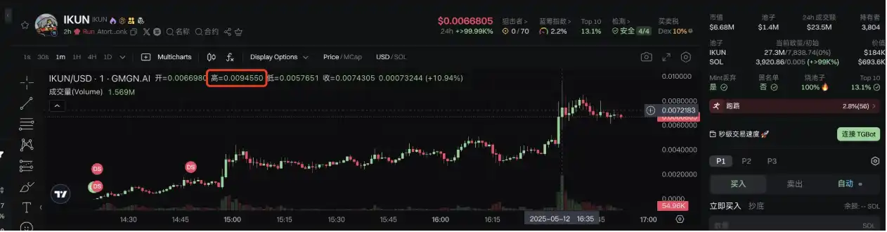 IKUN,以明星蔡徐坤的粉丝群体名称为 Meme 的代表性项目,因 Letsbonk.fun 平台知名大 V @theunipcs(Bonkguy)在中文社区博主及社区成员的宣传(CX)下而获得海内外 Meme 币社区的关注。据 GMGN 平台信息,IKUN 代币信息如下: