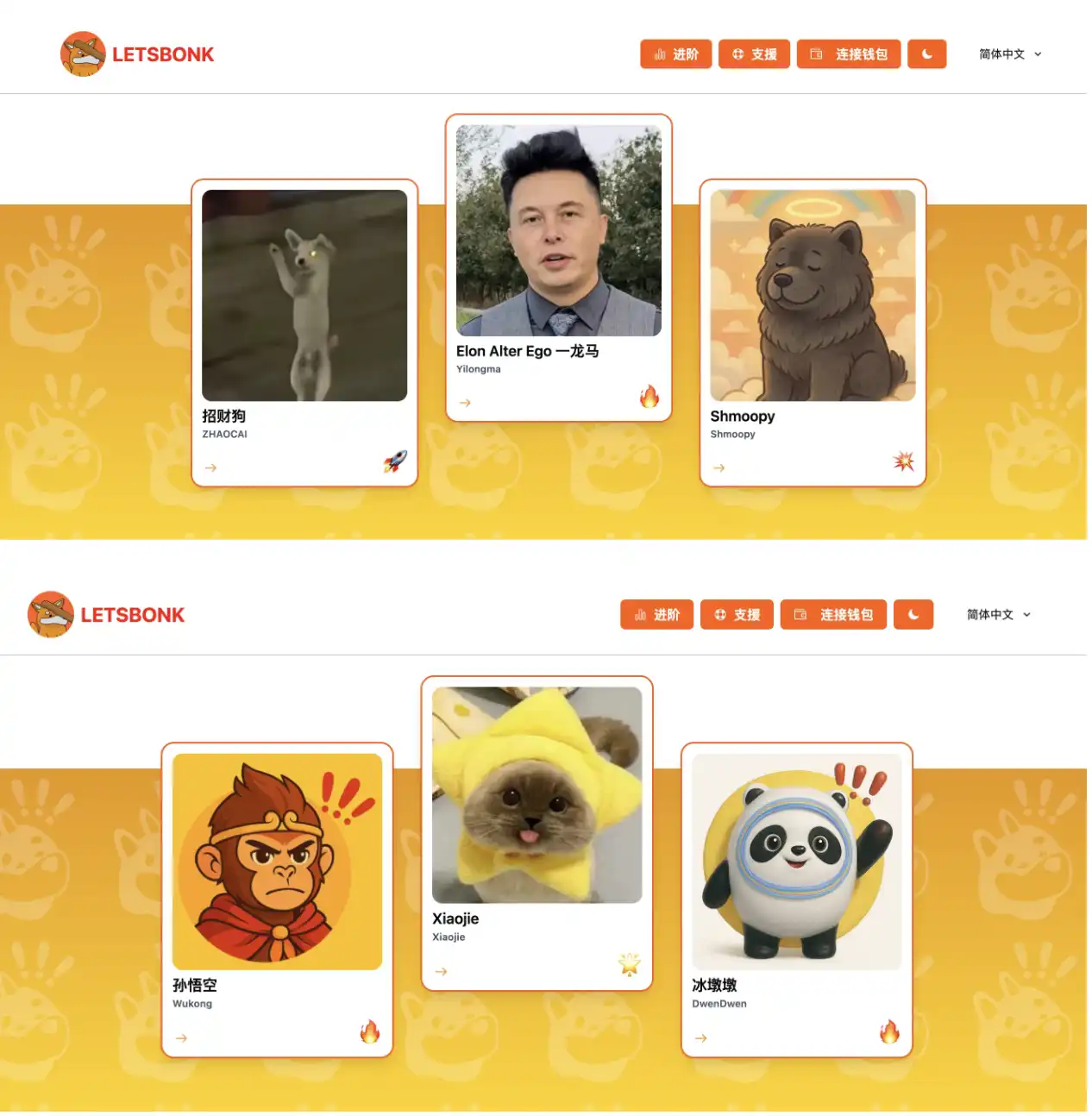 Letsbonk.fun 再度火爆起来,而这一次依然是凭借平台上的头部项目 Hosico、Useless。除此以外,与之前平台同名币 LetsBonk 等「平台型」Meme 币不同的是,今天出现了不少中文类的「带梗」Meme 币,如孙悟空(WuKong)、一龙马(Elon Alter Ego)、招财狗等等,而其中最为火爆的,却是经久不衰的明星蔡徐坤相关的 Meme 币 IKUN。Odaily 星球日报将于本文对 Letsbonk.fun 平台的代表性项目予以简要盘点。