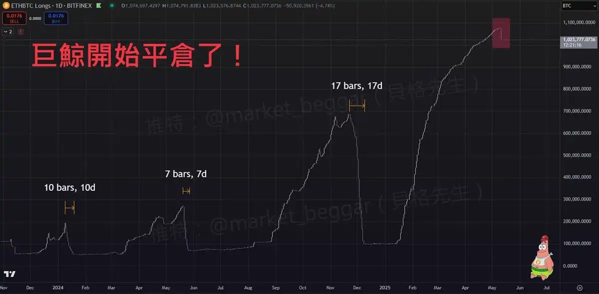@market_beggar 观测到,Bitfinex E/B 巨鲸开始平仓,并认为如果该巨鲸接下来几天都维持高速平仓的操作,可以猜测巨鲸是不再看好 ETH 的上涨空间,准备结利离场,接下来要重点关注平仓时间。