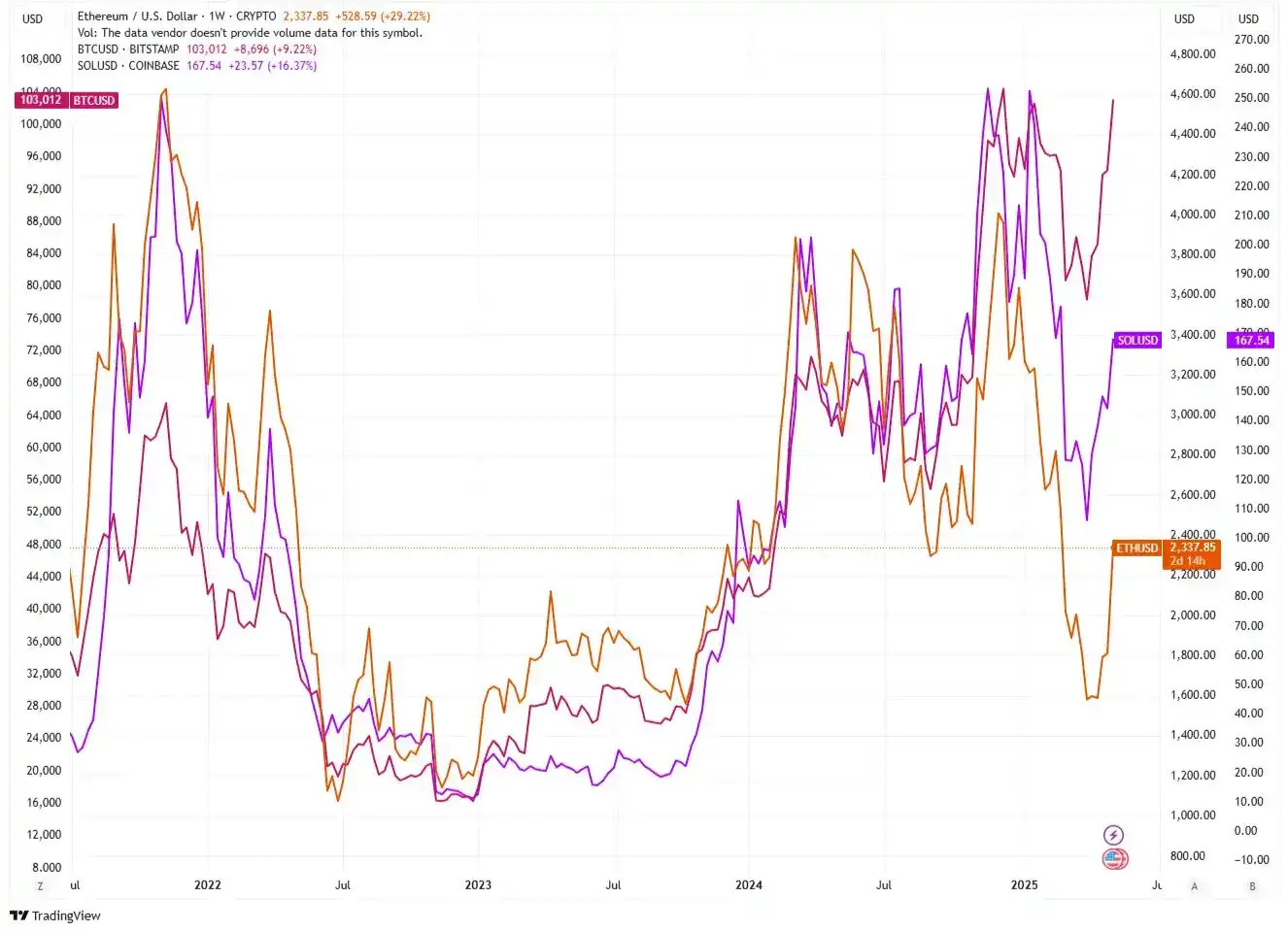 尽管以太坊出现了这些颇具前景的发展态势,但它仍面临着巨大的阻力。目前,以太坊 ETH 的交易价格约为 2200 美元,不到其在 2021 年 11 月创下的 4878 美元历史最高价的一半。而比特币和 Solana 在 2025 年均已突破此前纪录,以太坊却仍在低位徘徊。