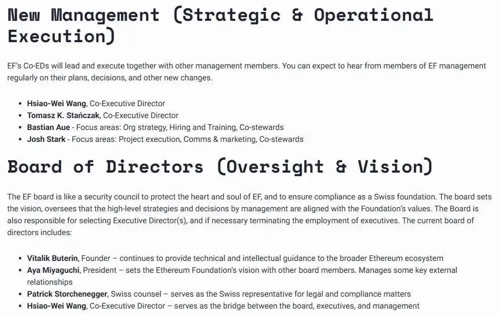 基金会新上任的领导层迅速明确了工作重点:扩展以太坊主网容量、改进 Layer 2 rollups 以及提升用户体验。两位 co-director 在一份公开声明中写道:「我们深知,需要为开发者、创始人、机构等在以太坊上进行开发和采用以太坊技术的征程提速。」
