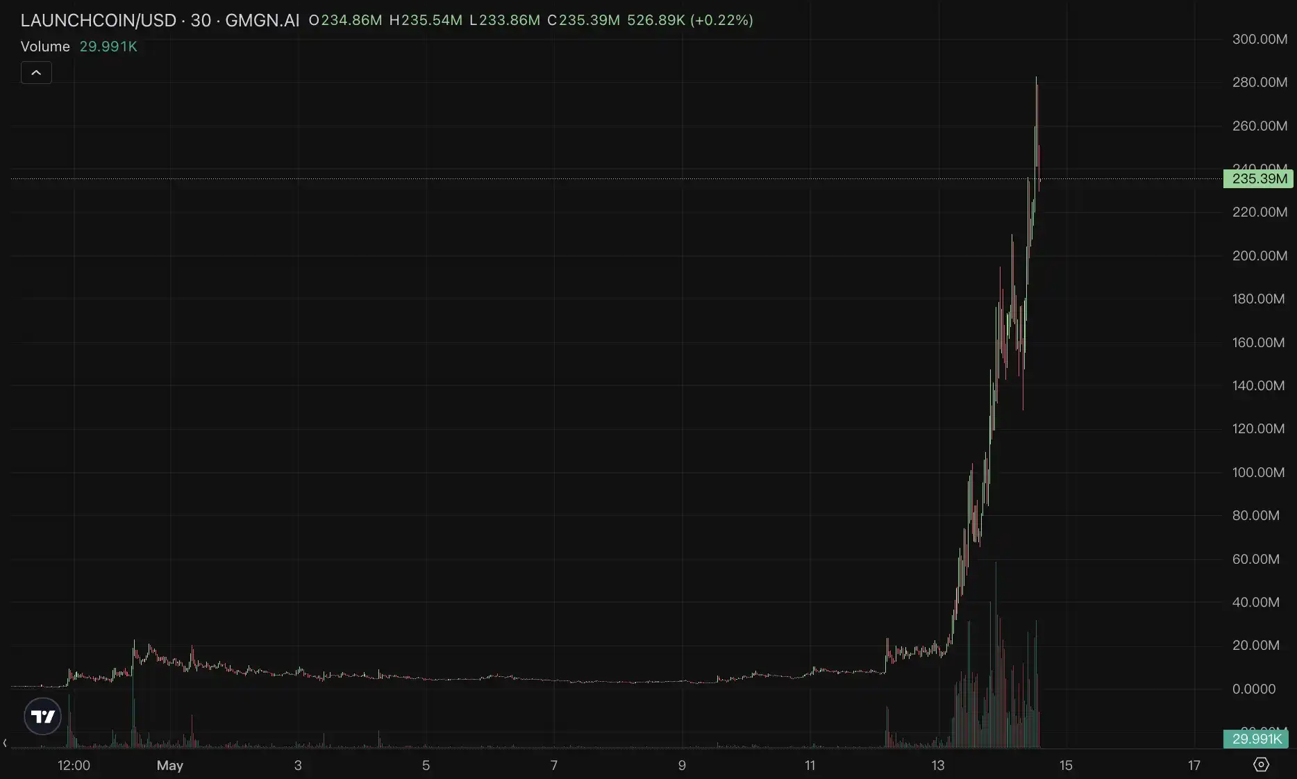 LAUNCHCOIN 当前市值达 2.35 亿美元,24 小时涨幅达 220%。