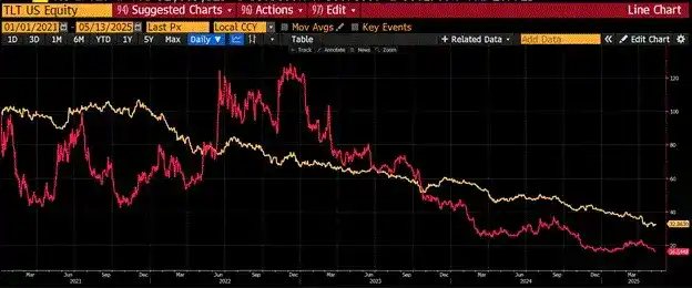 这个图表展示了美国长期国债 ETF(TLT)以黄金计价(金色)和比特币计价(红色)的表现,自 2009 年起以 100 为基准。从 2021 年至今,国债相较黄金和比特币分别贬值了 64% 和 84%。