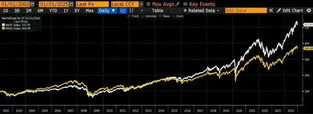 自 2022 年以来,MSCI 美国指数(白色)表现优于 MSCI 世界指数(金色)148%:美国股市的特殊表现。