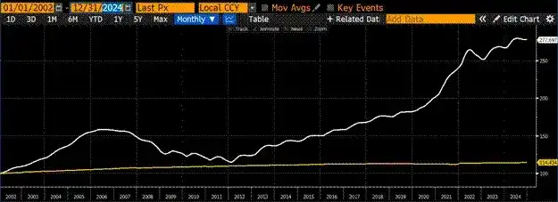 美国 15-64 岁工作年龄人口(金色)仅增长了 14%,但 Cash Shiller 全国房价指数(白色)增长了 177%:美国房地产市场的特殊表现。这相当惊人,因为 2008 年全球金融危机的数据也包含在内。
