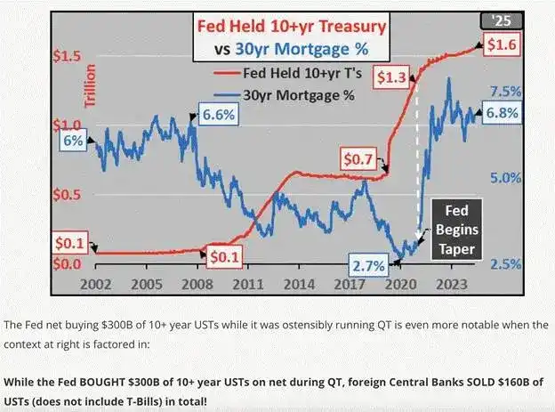 美联储正在缩减其资产负债表。然而,它在如何实现这一目标上拥有一定的自由裁量权,尤其是因为政策的任务是净减少,而不是在所有期限类别中均匀减少。耶伦(Yellen)和现在的贝森特(Bessent)需要为政府庞大的债务提供资金。外国投资者和美国私营部门喜欢购买国库券,因为它们是短期债券并支付利息,意味着它们是高收益的现金替代品,比低收益的银行存款更受欢迎。但没有人愿意购买长期的,即 10 年及以上的国债。为了帮助耶伦和现在的贝森特筹集资金,美联储通过进行 10 年期国债的量化宽松(QE)给予了很大的支持。鲍威尔(Powell)引用政府赤字作为问题,但继续通过印钞机压低 10 年期收益率以保持政治上可接受的低水平,这种行为非常不诚实。