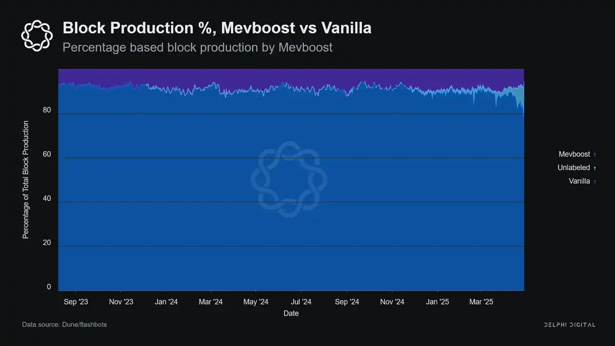 但这一方向的主要证据是 L1 区块提议者捕获的 MEV 份额下降。2024 年,大部分 MEV 通过 Flashbots 等系统被搜索者和中继者捕获,而非以太坊验证者。目前,90% 的以太坊区块通过 MEV-Boost 提议,其中相当一部分通过 Flashbots 关联的中继处理。