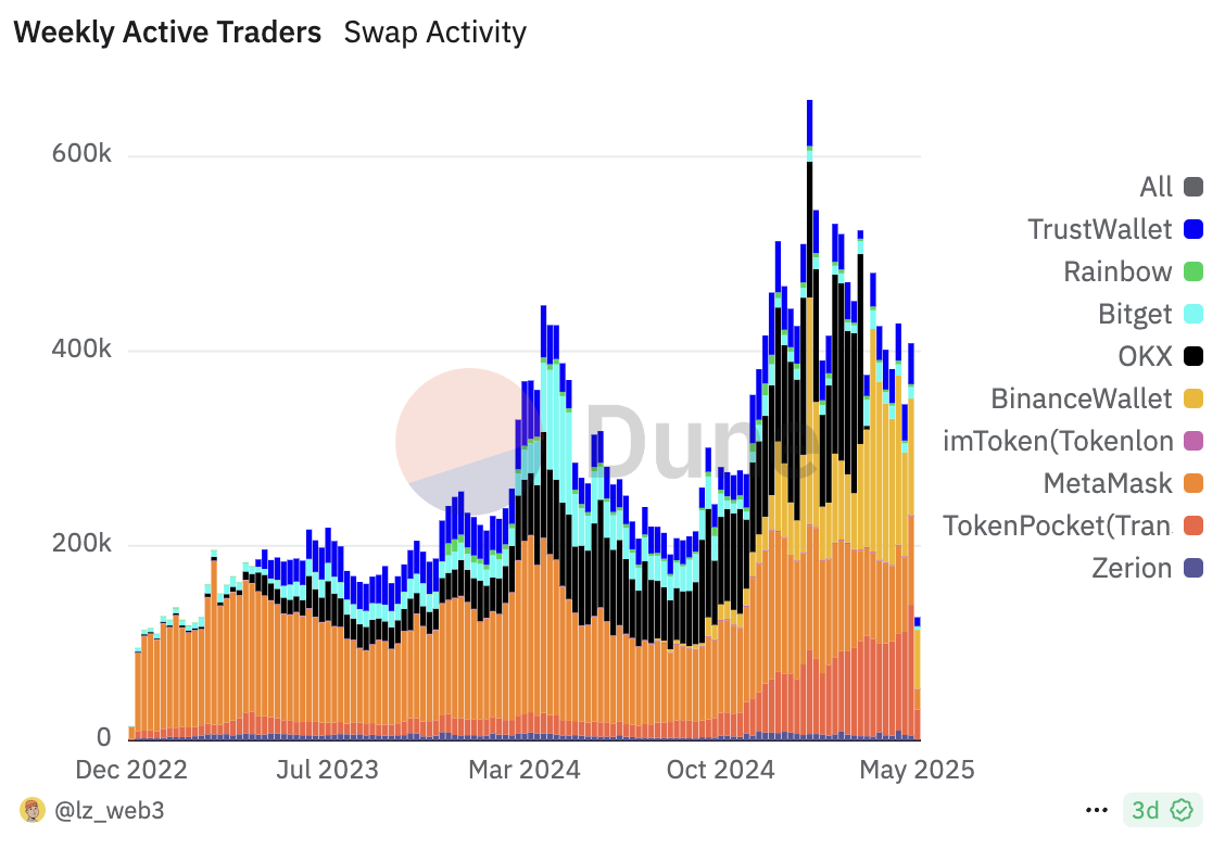 3 月,由于 OKX DEX 关停,Binance 钱包在这一时间点推出了 Binance Alpha2.0,通过将 Binance Alpha 直接集成到 CEX,用户可以直接使用所内资金进行 Alpha 代币交易。由此,Binance 钱包的交易量和活跃用户一举反超,占据加密钱包交易量 80% 份额,成为钱包产品增长曲线中最为陡峭的一环。