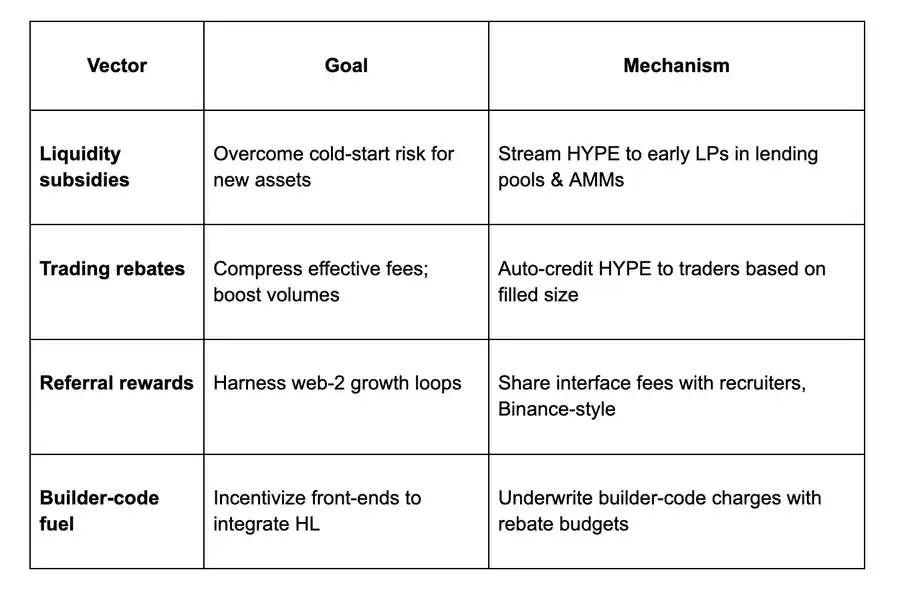 HUSD 在推动「Builder Code」商业模式的爆发中起着关键作用。Builder Code 是 Hyperliquid 的原生功能,允许一个界面运营者(interface operator)在代表用户提交的现货或合约交易中收取一定费用。它的目标是为 Hyperliquid 的「最后一公里分发」提供变现方式——也就是说,任何能有效吸引并留住用户的人,都可以通过 Builder Code 建立起一个不受技术或流动性限制的交易业务。