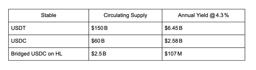 目前,大约有 25 亿美元的跨链 USDC 被锁定在 HyperCore 的订单簿中,并获得约 4.3% 的利息收益。这些收益每年可为 Circle Internet Financial 带来约 1.075 亿美元的收入,流入其私人资产负债表。每一笔新存入 Hyperliquid 的 USDC,都在进一步扩大 Circle 的现金流。但如果这些价值不是流向 Circle,而是反过来用于壮大 Hyperliquid 生态,会怎么样?在有机会突破现有框架的情况下,我们为什么还要被 USDC 这种过时的传统稳定币模式所束缚?