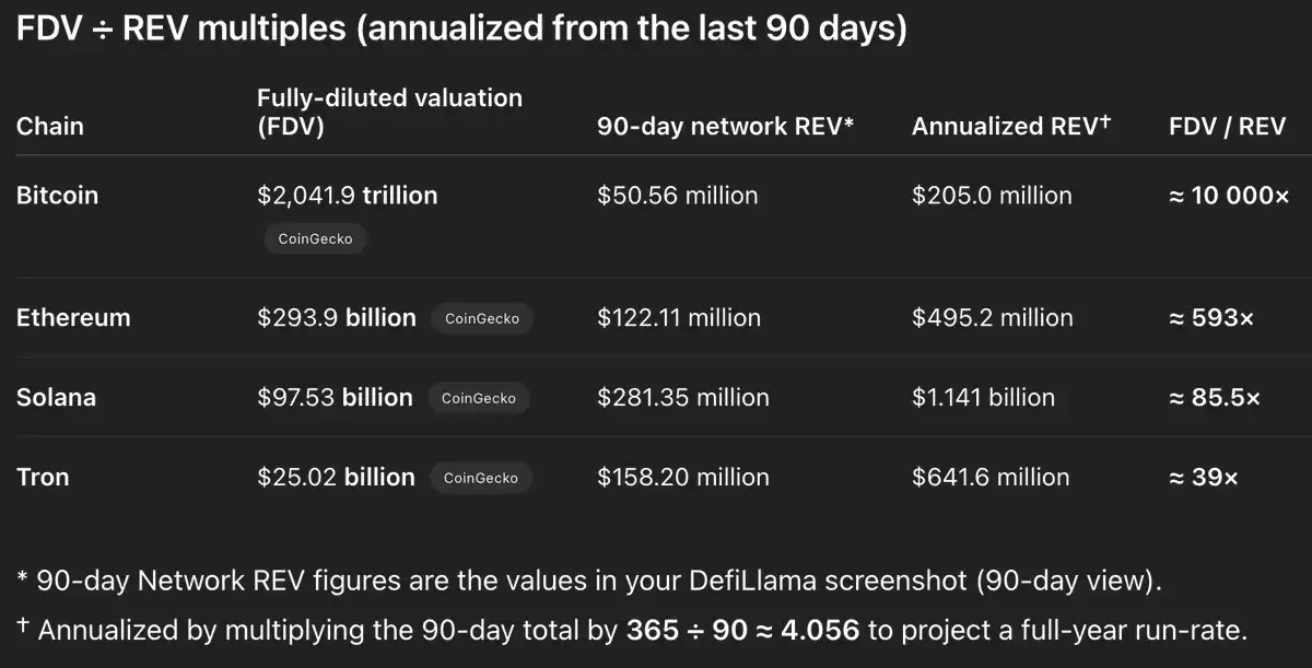如果我们用 REV 来比较各链的财务表现,像比较企业一样,那么它们的 FDV 与 REV 的比例如下: