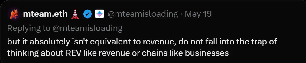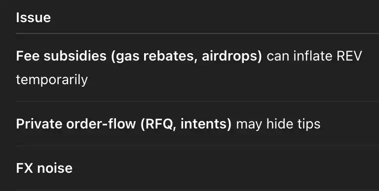 至少 REV(或 FDV/REV 比率)不足以单独用来评估一条链原生代币的合理价值。原因有三个: