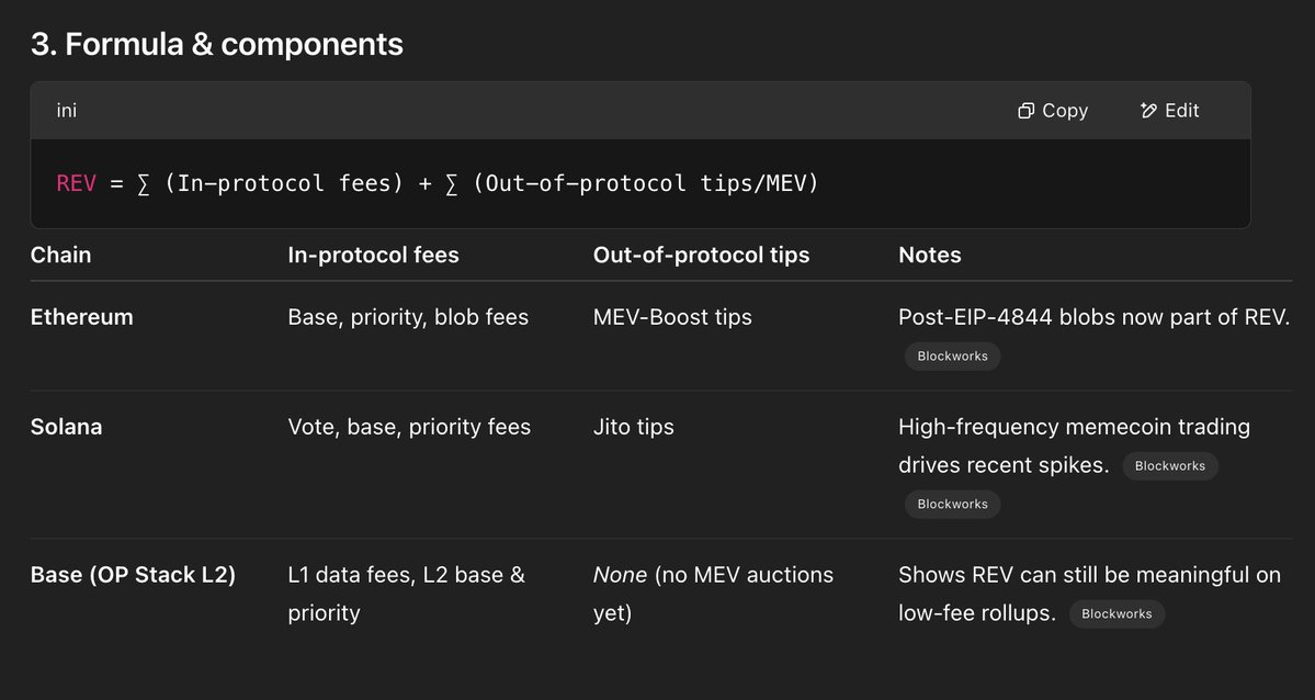 「REV 包含协议内的交易手续费和协议外用户为交易执行支付的小费,因此它衡量了链上交易的整体货币需求。」—@blockworksres